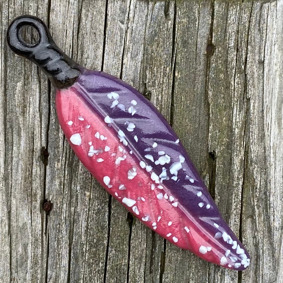 A fused glass feather pendant measuring approx. 4 5/8" long. Backed with clear glass.