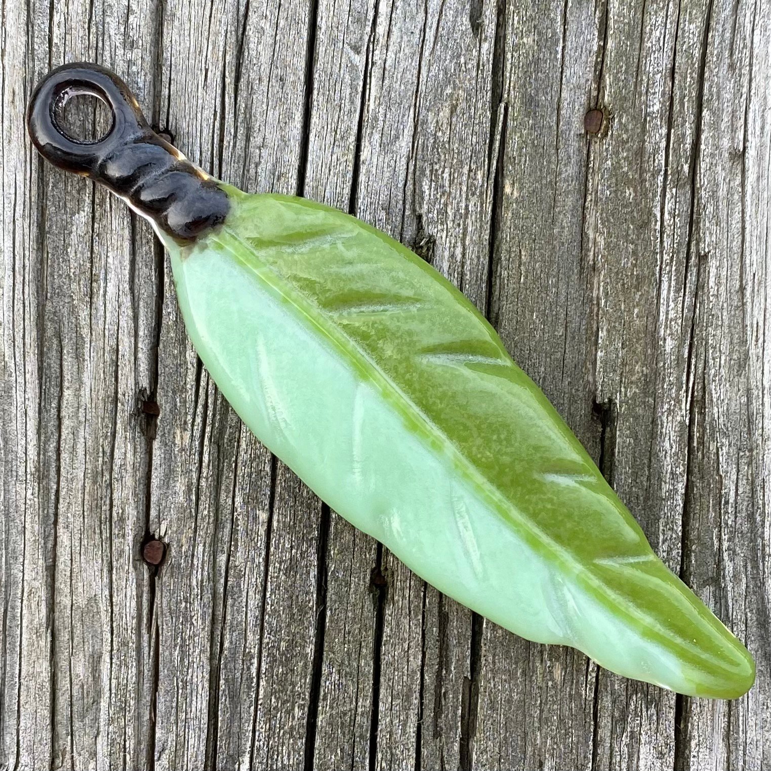 A fused glass feather pendant measuring approx. 4 5/8" long. Backed with clear glass.