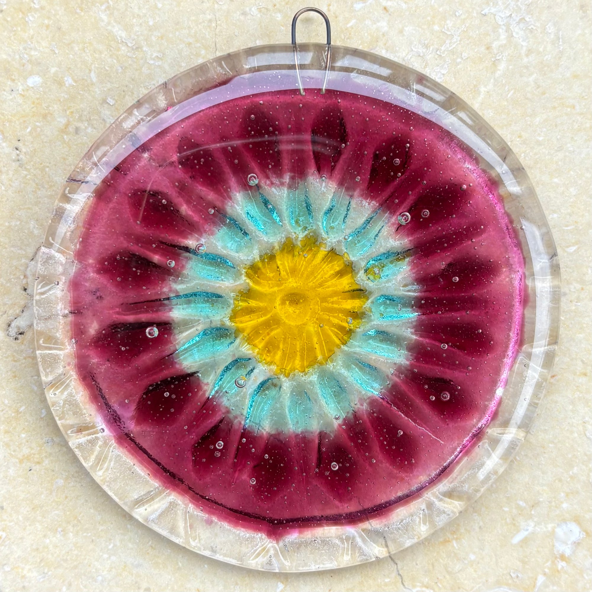 Fused Glass Yellow/Blue/Fuschia Mandala Sun Catcher